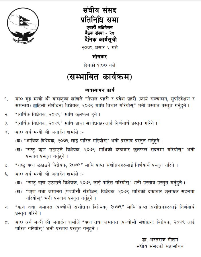 आर्थिक विधेयक २०७९ माथि छलफल गरी प्राप्त संशोधनलाई निर्णायार्थ प्रस्तुत गरिने पनि संसद् सचिवालयले जानकारी दिएको छ । यस्तै, अर्थमन्त्री जनार्दन शर्माले ‘राष्ट्र ऋण उठाउने विधेयक २०७९ लाई दफावार छलफल गरी पारितका लागि प्रस्ताव गर्ने कार्यसूची रहेको छ।