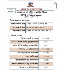 बिहीबार थपिएकासहित नेपालमा कूल संक्रमितहरुको संख्या ९८ हजार ६१७ पुगेको प्रवक्ता प्रा.डा.जागेश्वर गौतमले बताए ।नियमित प्रेस ब्रिफिङमा प्रवक्ता गौतमले बताए अनुसार बिहीबार देशभरमा सक्रिय संक्रमितको संख्या २६ हजार ६८४ पुगेको छ। २४ घण्टामा थप जना २ हजार ६७५ कोरोना संक्रमित व्यक्तिहरु निको भएर डिस्चार्ज भएका सहित डिस्चार्ज हुनेको संख्या ७१ हजार ३४३ पुगेको छ।