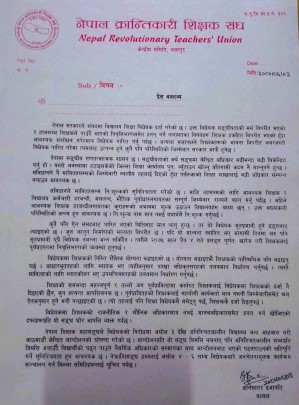 भक्तपुर । नेपाल सरकारले संसदमा ल्याएको विद्यालय शिक्षा विधेयक दर्ताविरुद्ध आज देखि (बिहीबारदेखि) नेपाल क्रान्तिकारी शिक्षक संघले जनचेतनामूलक कार्यक्रम सञ्चालन गर्ने भएको छ ।