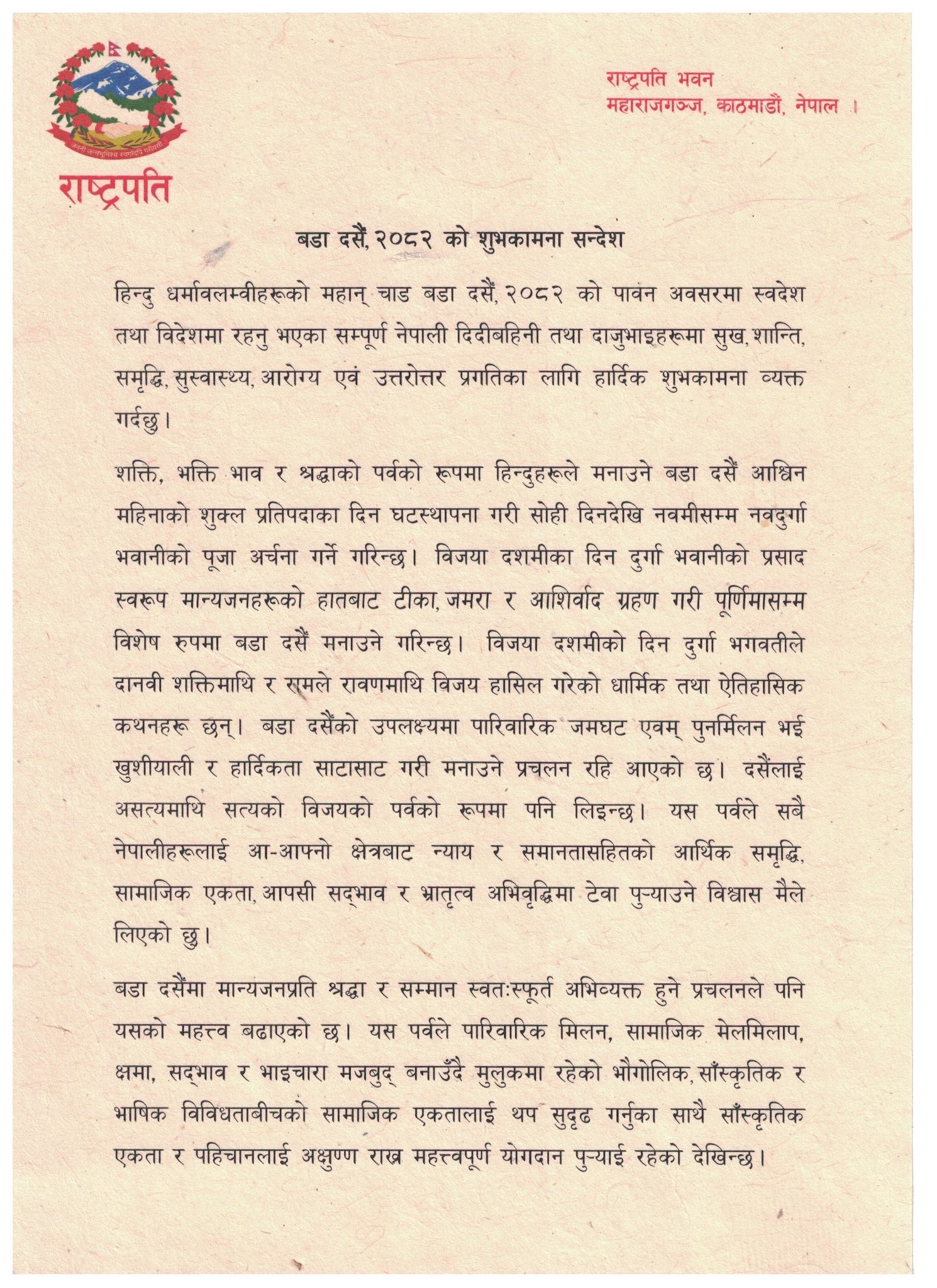 काठमाडौं, १३ असाेज । बडा दसैं २०८२ काे अवसरमा शुभकामना सन्देश जारी गर्दै राष्ट्रपति रामचन्द्र पौडेलले तोकिएको मितिमा प्रतिनिधि सभाको निर्वाचन सम्पन्न गर्न सबैलाई संयमित भई सहकार्य गर्न आग्रह गरेका छन् ।