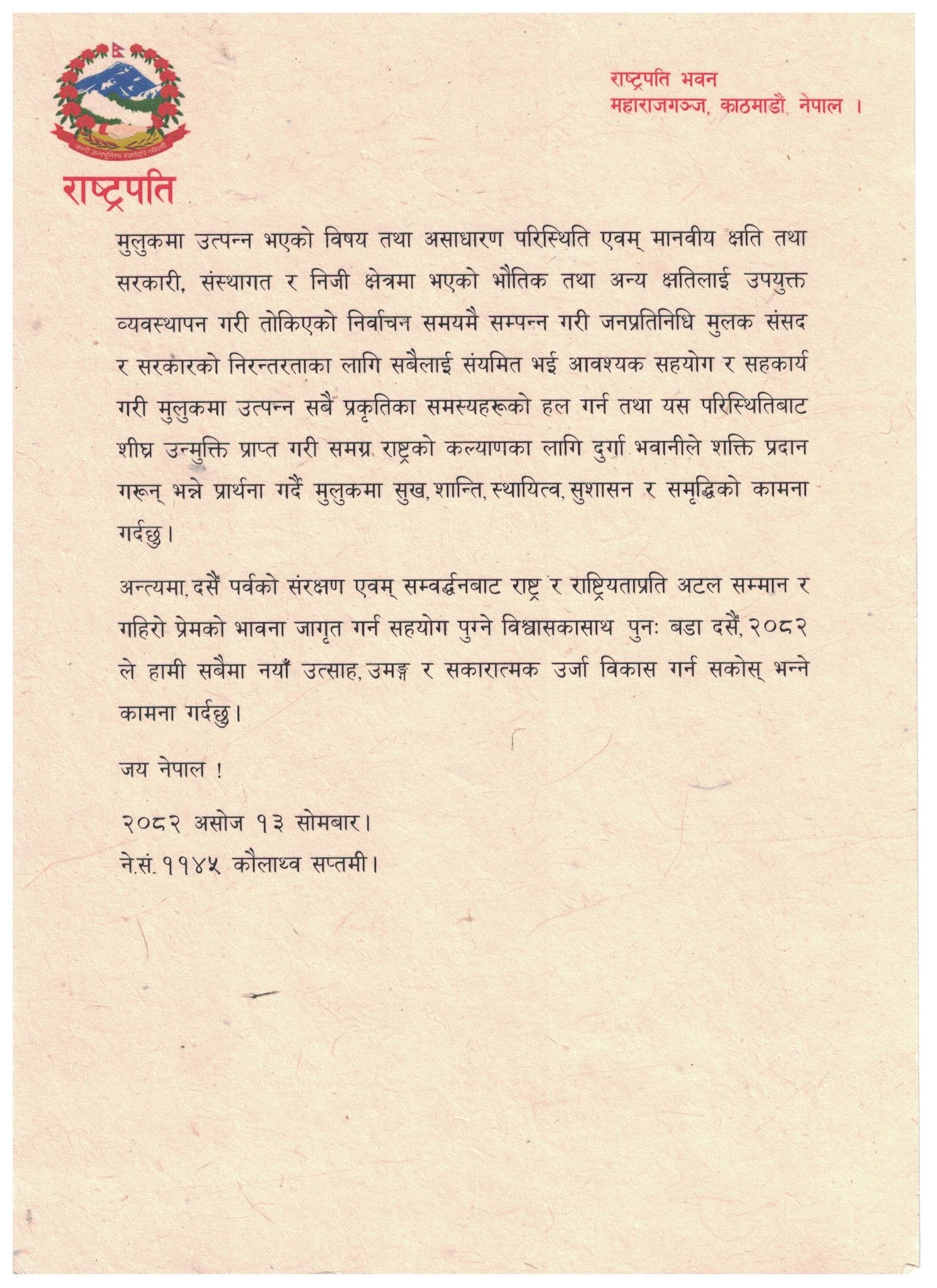 उनले आगामी फागुन २१ गतेका लागि तय भएको निर्वाचनलाई मुलुकको राजनीतिक निरन्तरता, जनप्रतिनिधि मूलक संसद् र स्थिर सरकारको आधारका रूपमा व्याख्या गर्दै सबैपक्षीय सहयोग अपरिहार्य रहेको बताए । राष्ट्रपतिले हाल मुलुकमा देखिएका असाधारण परिस्थिति, मानवीय क्षति तथा सरकारी, संस्थागत र निजी क्षेत्रमा भएको क्षतिलाई उचित व्यवस्थापन गर्न आवश्यक पर्ने उल्लेख गर्दै निर्वाचनमार्फत मुलुकलाई स्थायित्व र सुशासनतर्फ डोर्याउन सकिने विश्वास व्यक्त गरे ।