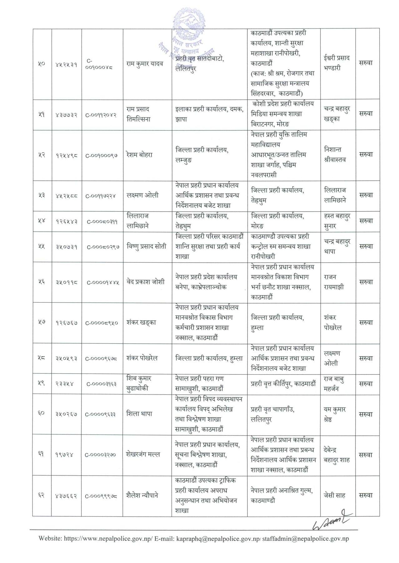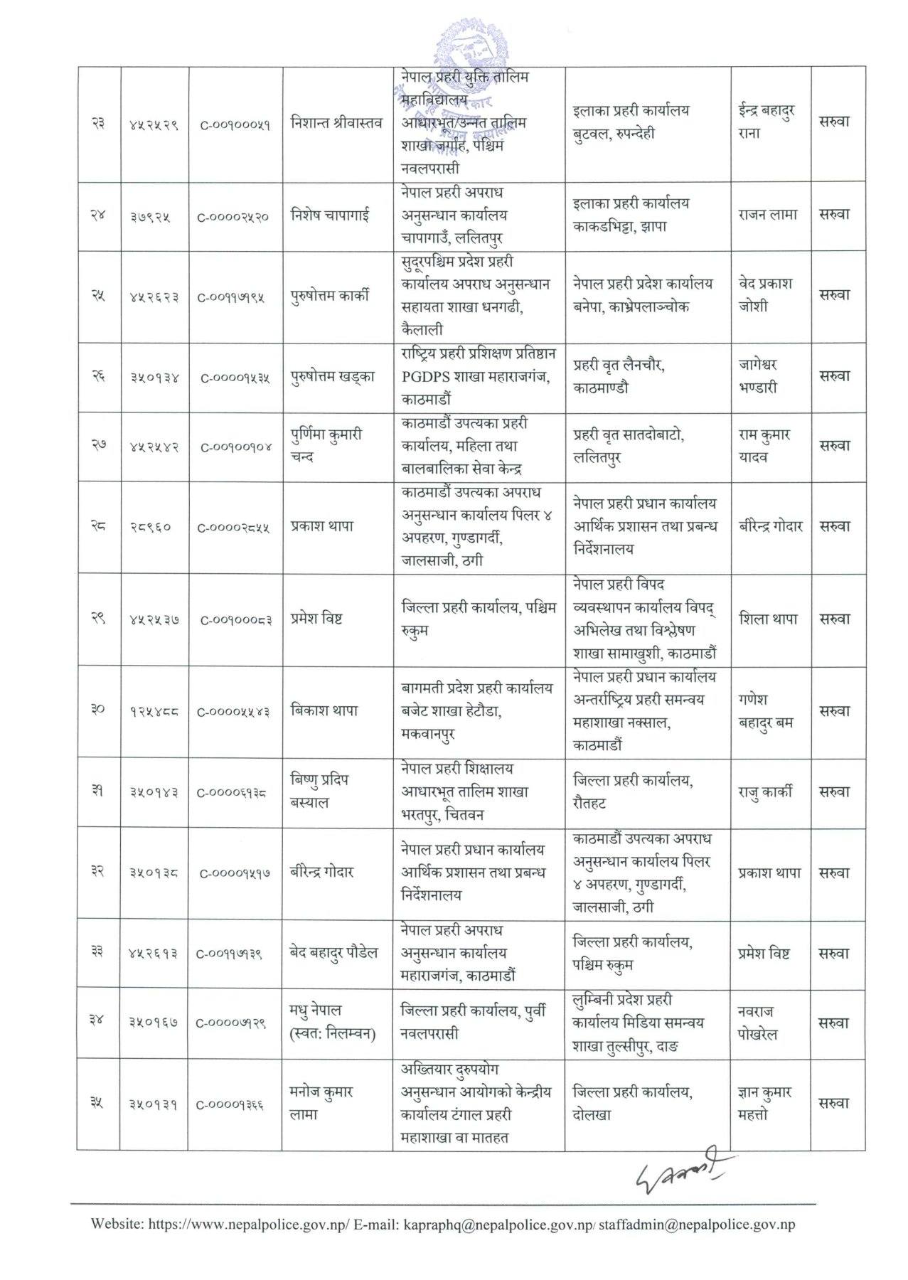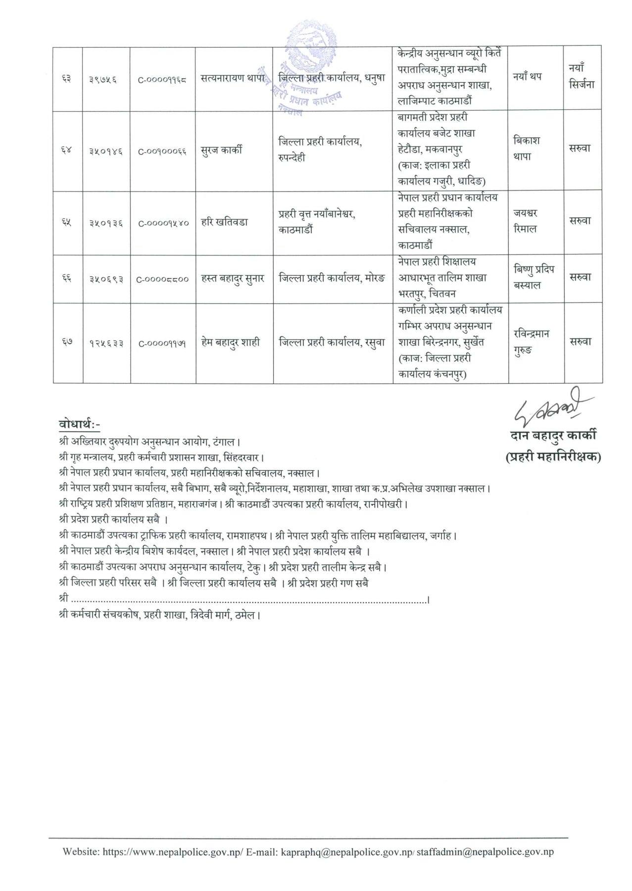 प्रहरी वृत्त जनसेवामा चन्द्रबहादुर थापाले जिम्मेवारी सम्हाल्ने भएका छन् । जिल्ला प्रहरी कार्यालय रसुवामा अशोक थापा सरुवा भएका छन् । लमजुङमा जितेन्द्र बस्नेत, इलाका प्रहरी कार्यालय सिमरामा दिलीप क्षेत्री, इलाका प्रहरी कार्यालय बुटवलमा निशान्त श्रीवास्तव, इलाका प्रहरी कार्यालय काँकडभिट्टामा निशेष चापागाईं र पश्चिम रुकुममा बेदबहादुर पौडेललाई सरुवा गरिएको छ ।