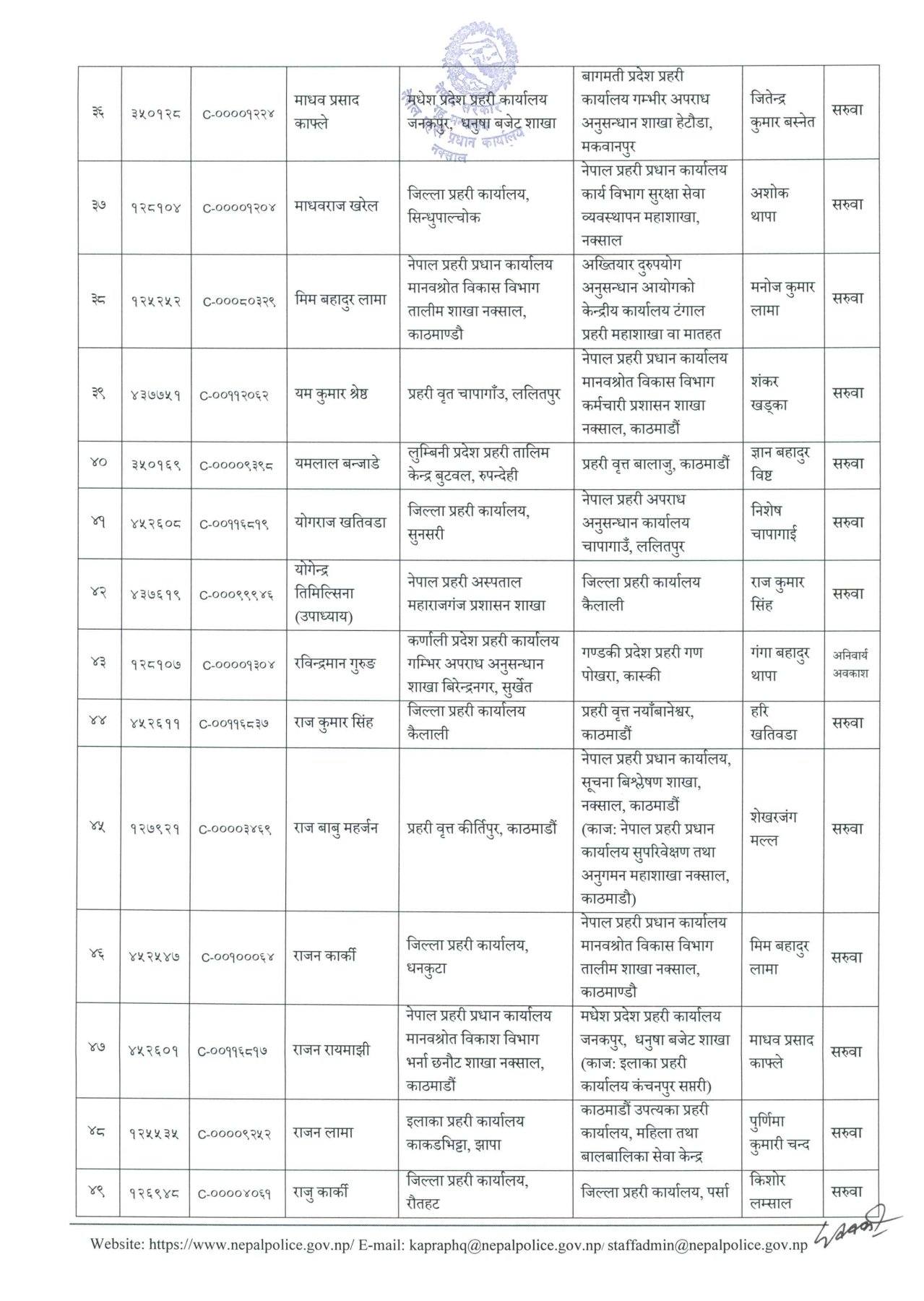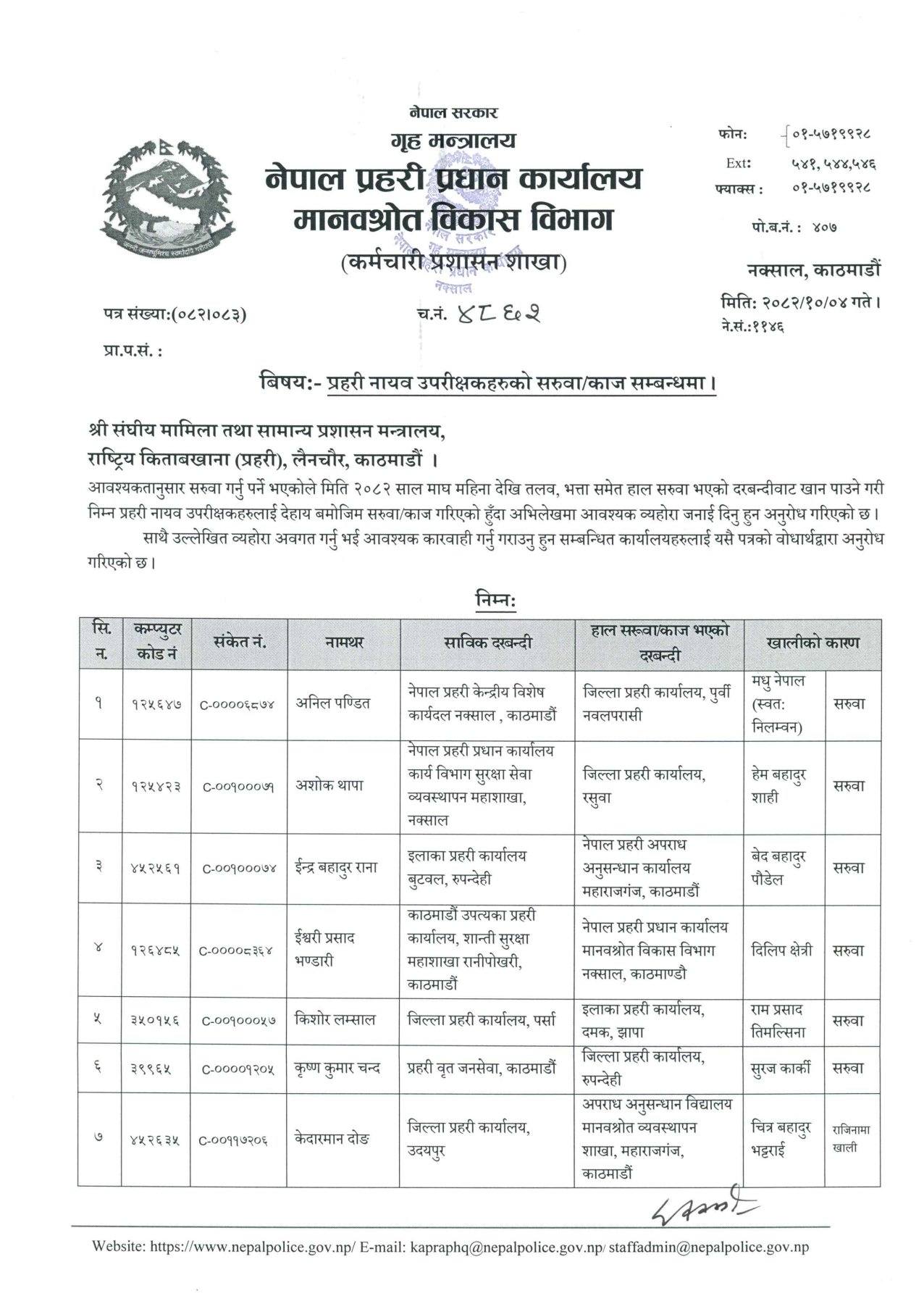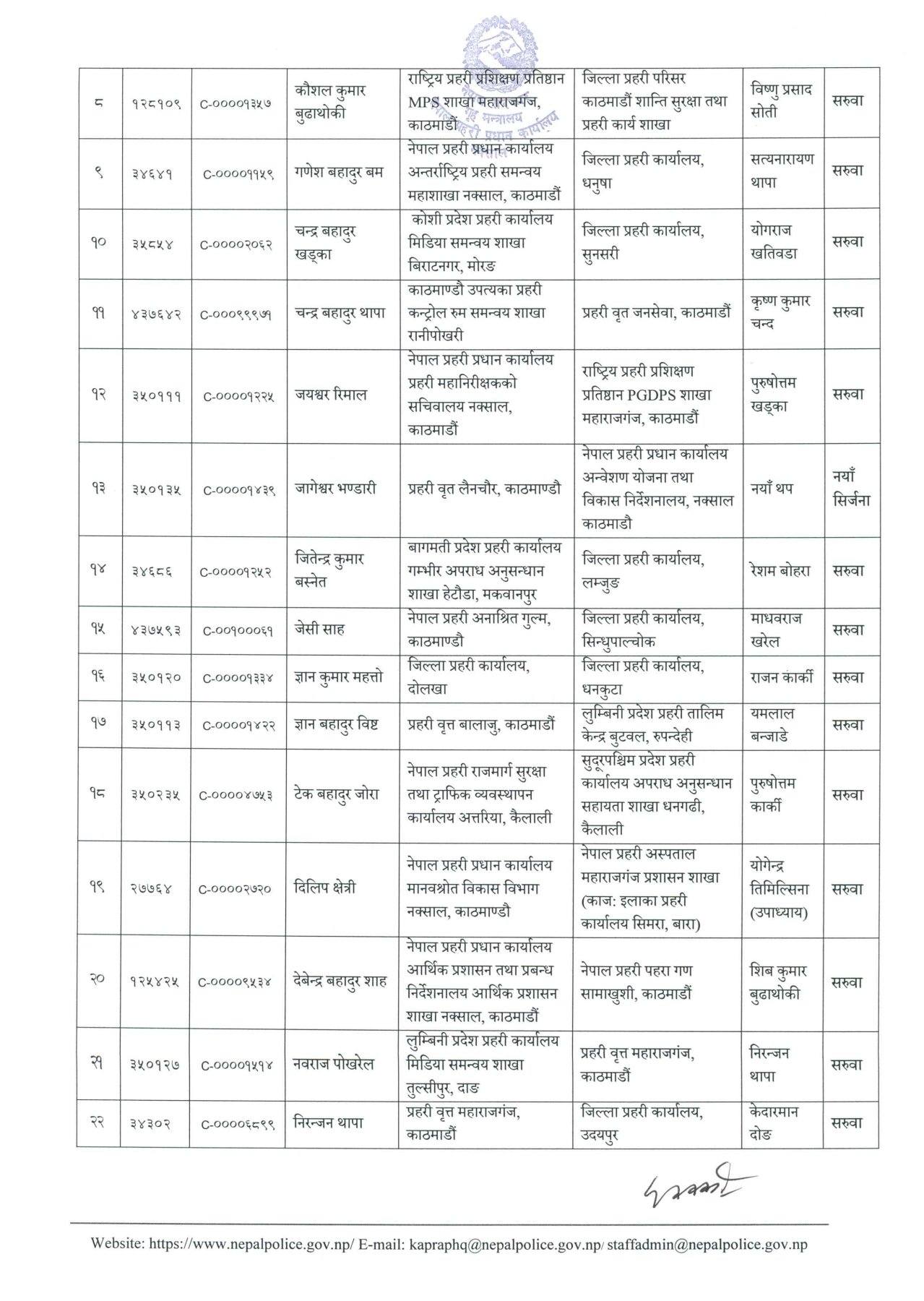 प्रहरी वृत्त जनसेवामा चन्द्रबहादुर थापाले जिम्मेवारी सम्हाल्ने भएका छन् । जिल्ला प्रहरी कार्यालय रसुवामा अशोक थापा सरुवा भएका छन् । लमजुङमा जितेन्द्र बस्नेत, इलाका प्रहरी कार्यालय सिमरामा दिलीप क्षेत्री, इलाका प्रहरी कार्यालय बुटवलमा निशान्त श्रीवास्तव, इलाका प्रहरी कार्यालय काँकडभिट्टामा निशेष चापागाईं र पश्चिम रुकुममा बेदबहादुर पौडेललाई सरुवा गरिएको छ ।
