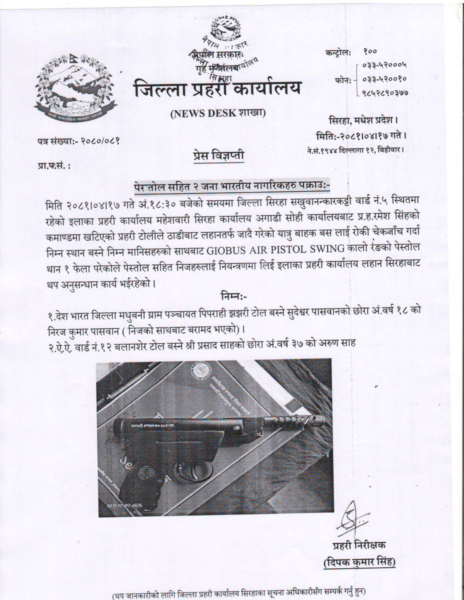 पिपराही ग्राम पञ्चायत झझरीका सुदेश्वर पासवानका छोरा १८ वर्षीय नीरजकुमार पासवान र सोही ग्राम पञ्चायतअन्तर्गत बलानशेर टोलका श्रीप्रसाद साहका छोरा ३७ वर्षीय अरुण साह एक थान पेस्तोलसहित पक्राउ परेका हुन् ।
